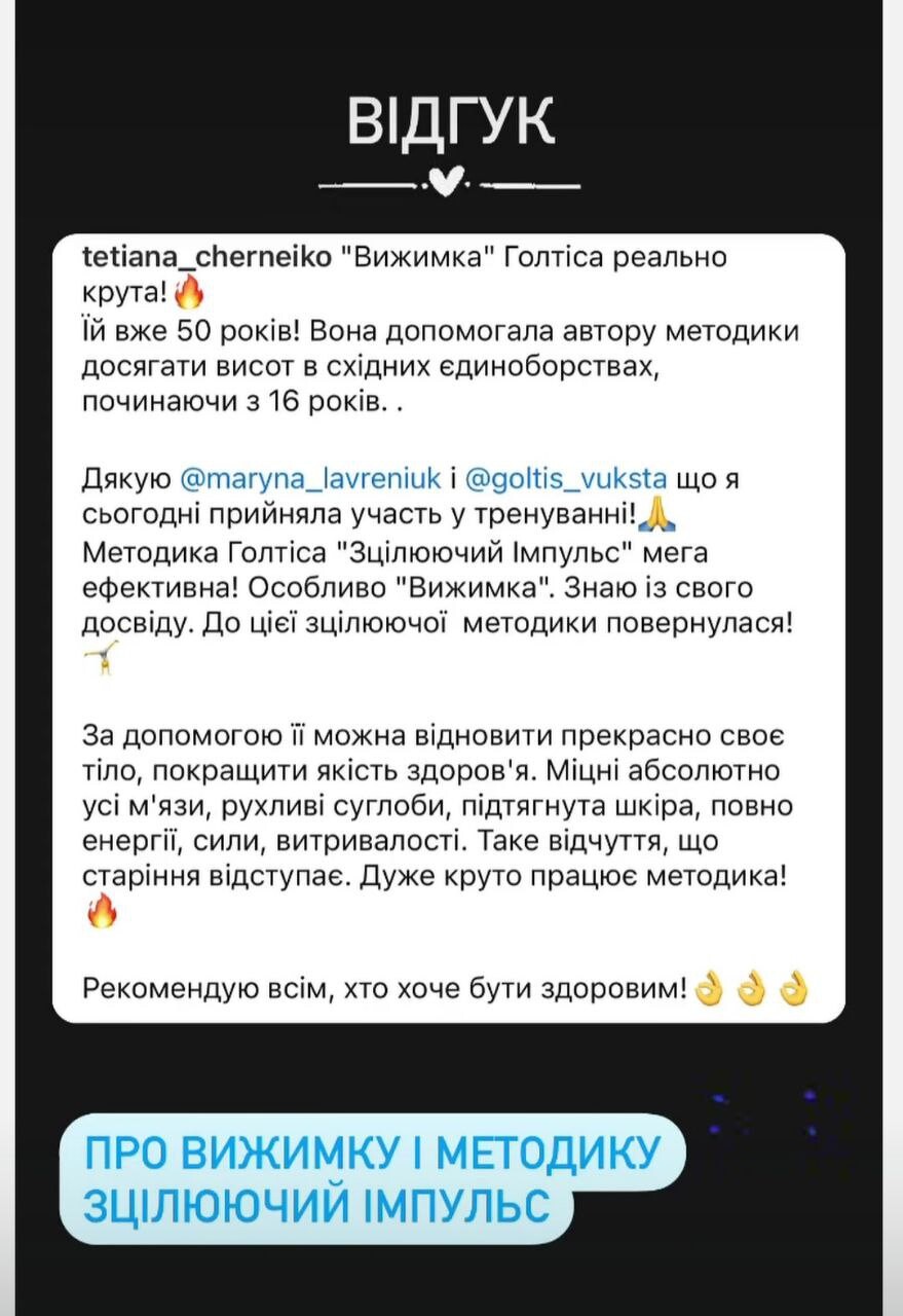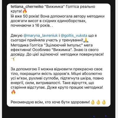 - To master the unique, proprietary Goltis sports-rehabilitation method: 14 “First Level” exercises personally taught by Goltis and master coach Kateryna, along with lectures on nutrition, fasting, and hardening practices.